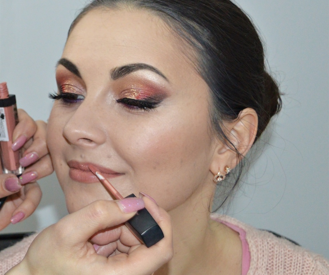 Якщо акцент макіяжу на очах, краще не робити губи яскравими. Щоб це виглядало не вульгарно. Ми обрали помаду натурального відтінку, а також використали олівець для губ на один тон темніший, ніж помада. Це додало графічності губам.