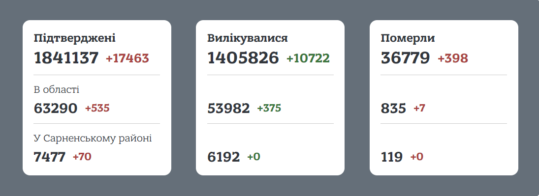 Всього в Сарненському районі захворіли 7477 жителів. 119 летальних випадків. Офіційно одужали 6192 особи.