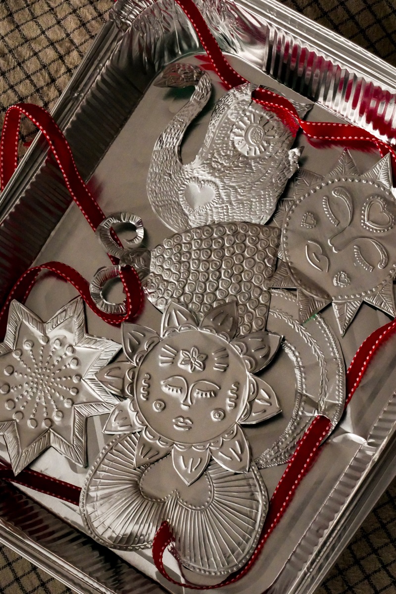 Карбування — нескладний і медитативний процес створення фактурного декору з тонкого металу шляхом тиснення. Для роботи необхідні ножиці, мʼяка підкладка, олівець, папір, інструменти для тиснення (або ж стилус, ручку чи зворотний бік пензля) й основа — алюмінієві контейнери з торгцентру «Норма» за адресою вулиця Військова, 20. Для початку слід намалювати або роздрукувати ескіз малюнків («aluminum foil embossing» у Pinterest). Далі — покласти фольгу на мʼяку основу й обвести контур ескізу. Наступний етап — обережно натискати лінії по контуру, щоб сформувати рельєфний малюнок. Вирізаємо фігуру, робимо отвори для стрічок — готово!