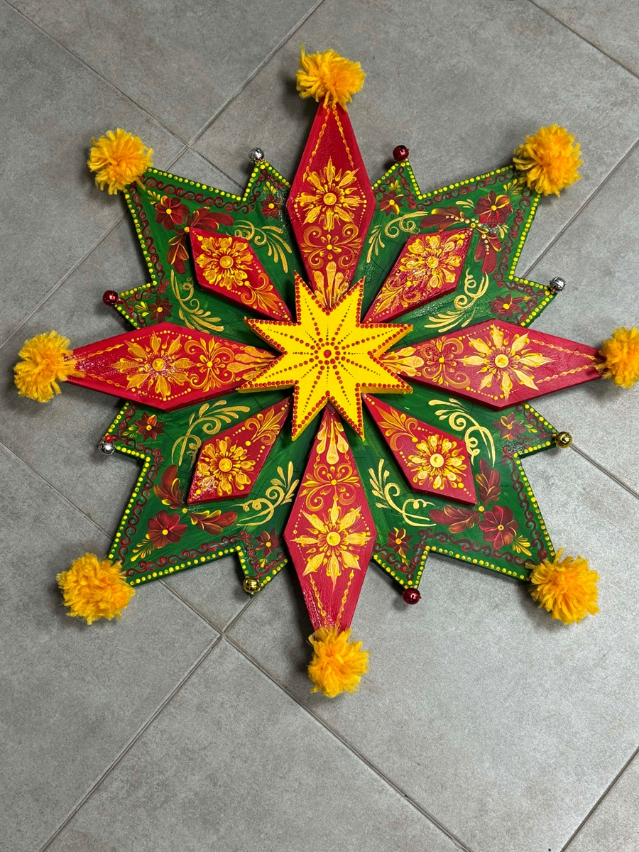 На гладкому поштовому картоні, який добре підходить для розпису акрилом, гуашшю або кольоровими маркерами, треба розписати зіркові промені, узори (петриківка, геометрія, орнаменти), покрити одним кольором (чорним, червоним, зеленим) і прикрасити крапковим розписом. Далі — за допомогою кнопки зʼєднати зірки з паличкою для суші. На завершення виріб можна оздобити блискітками й золотим маркером та привʼязати стрічку на паличку. І вифлеємська зірка — готова!