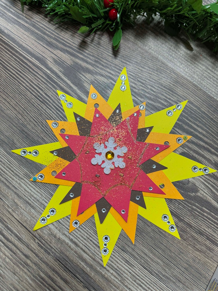 Наступний етап — створення обʼєму. Із кольорового картону потрібно вирізати шаблон 8-променевої зірки, проте трохи більшого або меншого розміру. Далі — приклеїти кольорові елементи від більшого до меншого, зʼєднуючи їх клеєм у серединці. Їх можна задекорувати дощиком або блискітками.