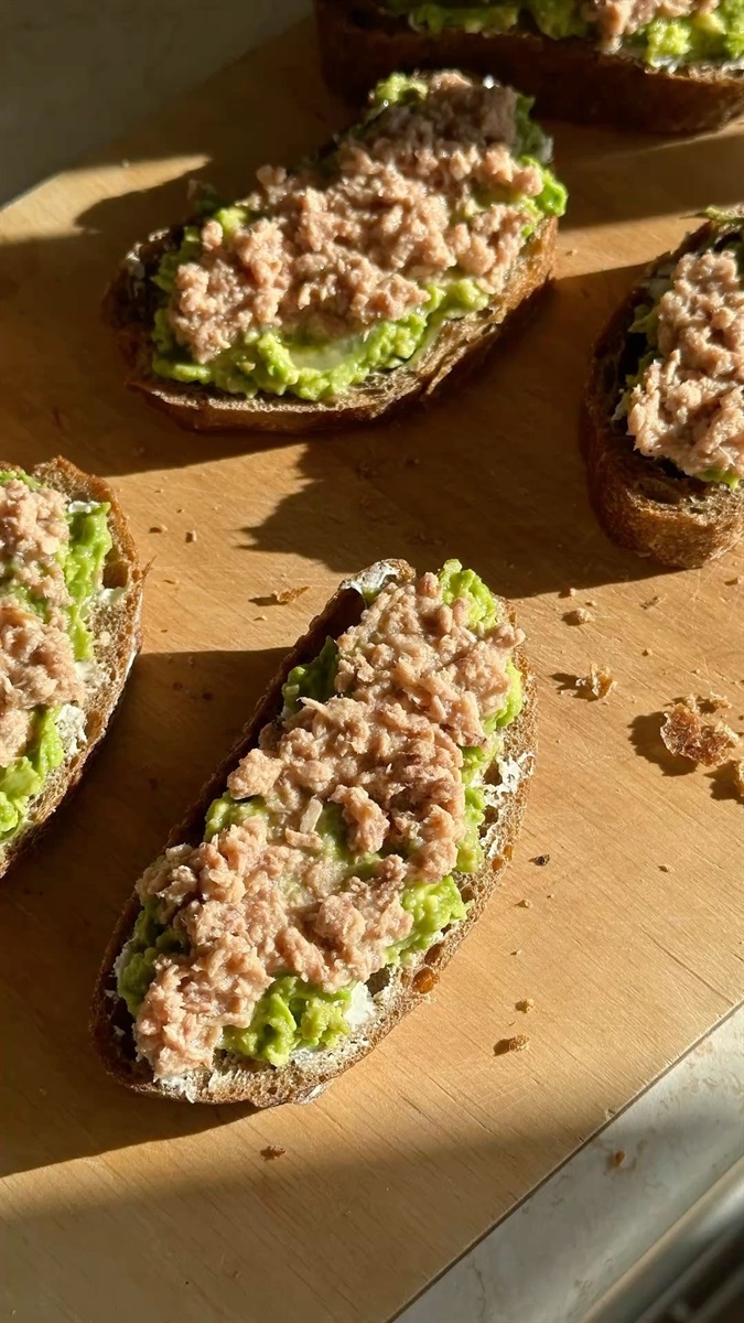 Приготування. Підсушуємо хліб на пательні без олії. Розрізаємо авокадо на дві частини, видаляємо кісточку, очищуємо шкірку. Розминаємо мʼякоть виделкою. Додаємо консервований тунець, дрібку солі, чорного перцю й трохи лимонного соку. Викладаємо масу на тости і смакуємо.