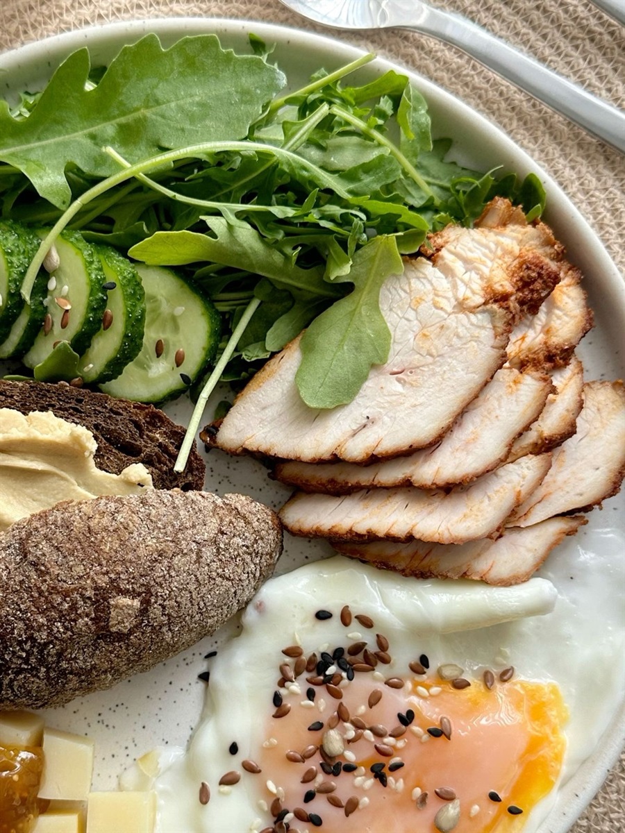 Приготування. Готуємо яйця (варимо, смажимо чи пашот), якщо не любите яйця — додаємо більше курки. Нарізаємо скибками хліб, сир, а також курку або шинку. Нарізаємо або розморожуємо овочі. До слова, хліб можна замінити консервованою квасолею, будь-якою крупою, макаронами або картоплею (4-5 столових ложок). Утім Світлана зазначає: крупи, які швидко готуються чи запарюються, не є складними вуглеводами, тож не зможуть наситити.