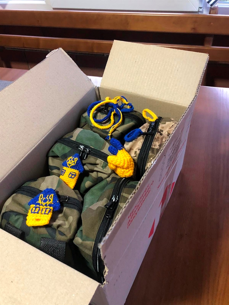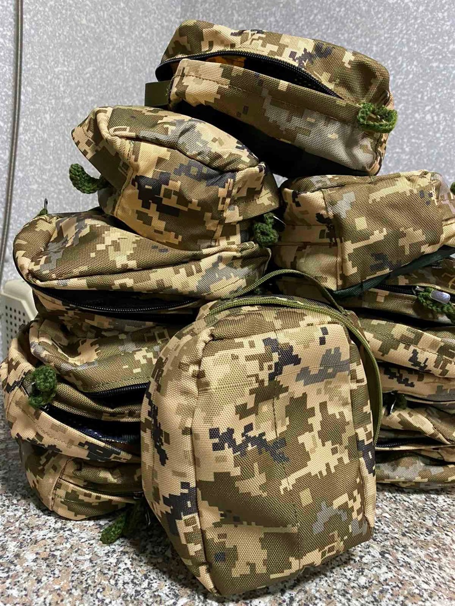 — Коли іноземні партнери передавали медикаменти й гуманітарну допомогу, виникла потреба в тому, де їх зберігати, в чому відправляти медикам і військовим. Торбинка мала бути зручною, мобільною, мала закріплюватися за пояс. Думали, з чого шити, хто це буде робити. Дивилися в «Аврорі» аналоги, якісь старі косметички, як їх робити. Потім знайшли тітку Марію, швачку. Весняним днем сіли на лавку і попросили допомогу в навчанні. Починали з меблевої тканини, відходів, шукали по місту стропи, Наталка принесла ремені від дитячих штанців. Якісь тканини повибирали, зібралися з дівчатами в мене, в закритій альтанці. Поставили чотири побутові швейні машинки, зробили поряд стіл для розкроювання. Це був довгий процес: вчилися, як вшивати замки, переробляли, шили, розшивали. Місяць-два збиралися десь о 17-18 і розходилися перед комендантською, тоді вона з 22-ї була, — зазначає Олена. — Згодом кожна почала працювати в себе вдома, а я, відповідно, координувала. Хтось викроїв — забрала, занесла тим, хто шиє, хто обметує і так далі. Тепер дивлюся на перші аптечки, то, думаю, їх можна в музеї залишити (сміється — прим. авт.). Зараз вироби теж неідеальні. Але ми робимо те, що можемо, і намагаємося краще.