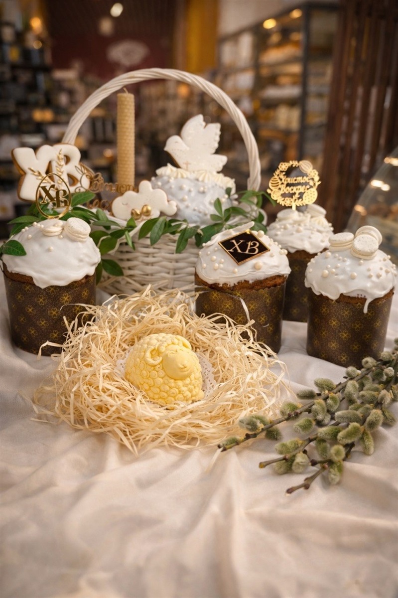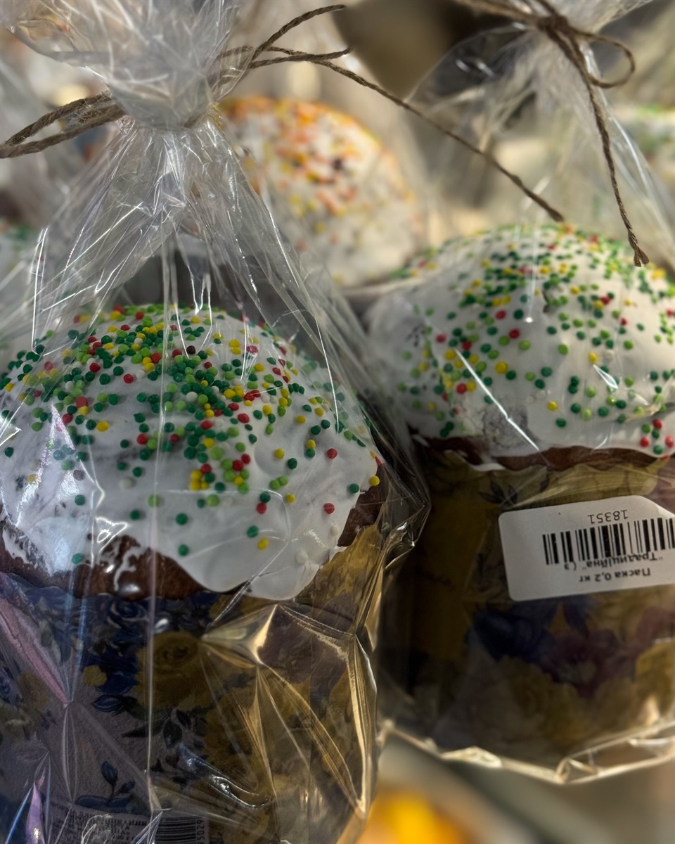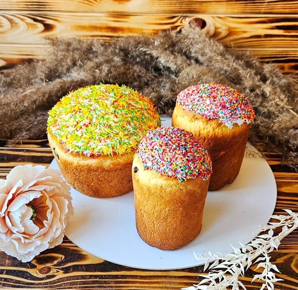 Кондитерка пропонує традиційні ванільні паски, оздоблені кондитерською посипкою. Вартість: 50 гривень (250 г), 65 гривень (300 г), 80 гривень (500 г).
