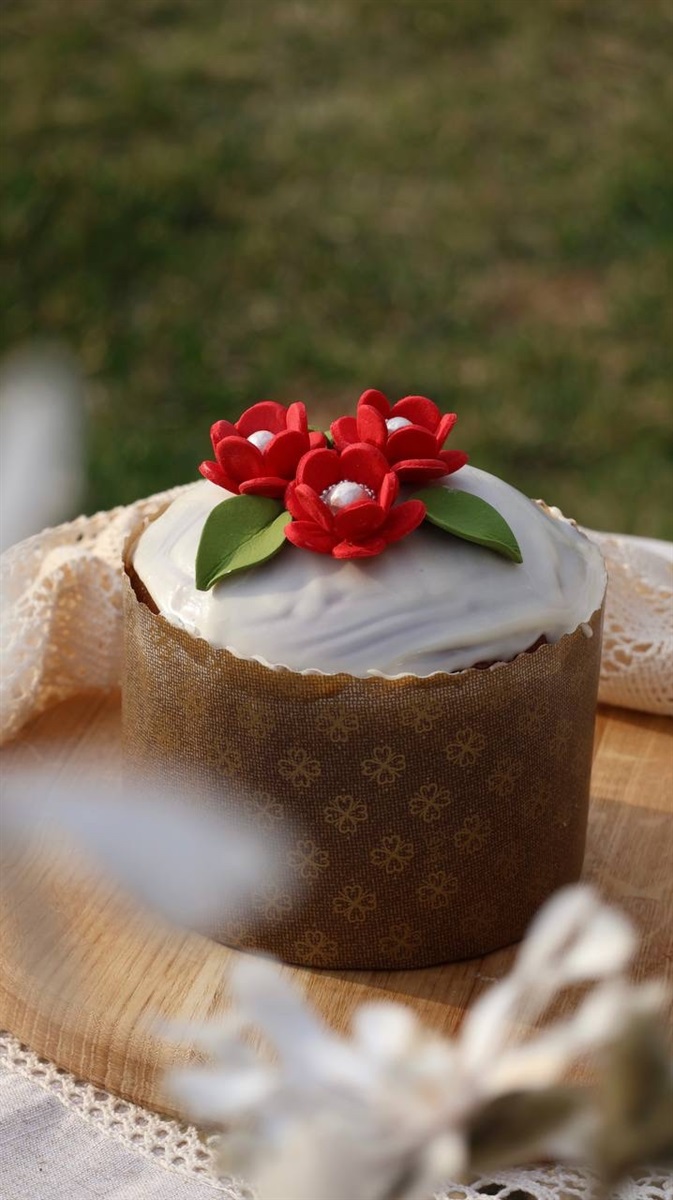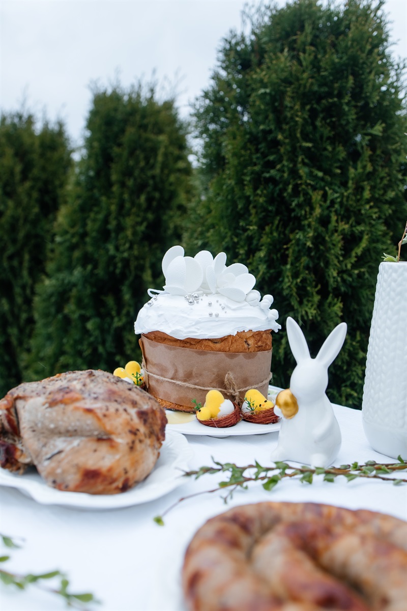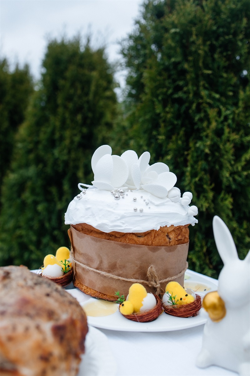 Паски від «Мацика» — пухкі, ароматні, ніжні за текстурою всередині й водночас мають румʼяну скоринку зовні. Оздоблені срібними цукровими перлинами та білими квітами. Вартість — 280 грн (550 г) та 450 грн (800 г). Додати до замовлення можна мʼясні делікатеси власного виробництва.