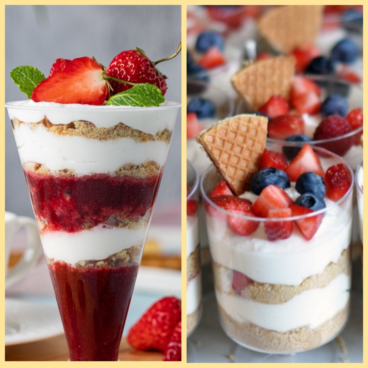 Знаменитий англійський десерт, що складається з бісквітного тіста з заварним кремом, фруктовим соком або желе зі збитими вершками. Всі інгредієнти викладаються шарами в склянці. Порційні міні-десерти в стаканчиках ідеально підійдуть для вашого святкового фуршету.