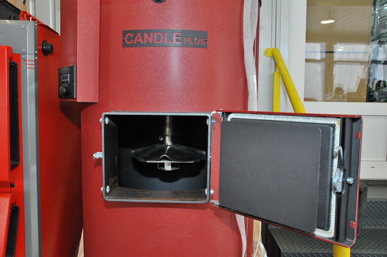 Котел тривалого горіння "Candle". Перевага в тому, що у верхньому горінні горить тільки п’ять сантиметрів дров чи опалювального матеріалу (торфу, брикету, щепи, тирси). Це майже всеїдний котел. Якщо зранку родина йде на роботу й повертається лише ввечері, то цей котел підходить їм ідеально. Він працює цілий день в автоматичному режимі без додаткового завантаження.